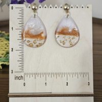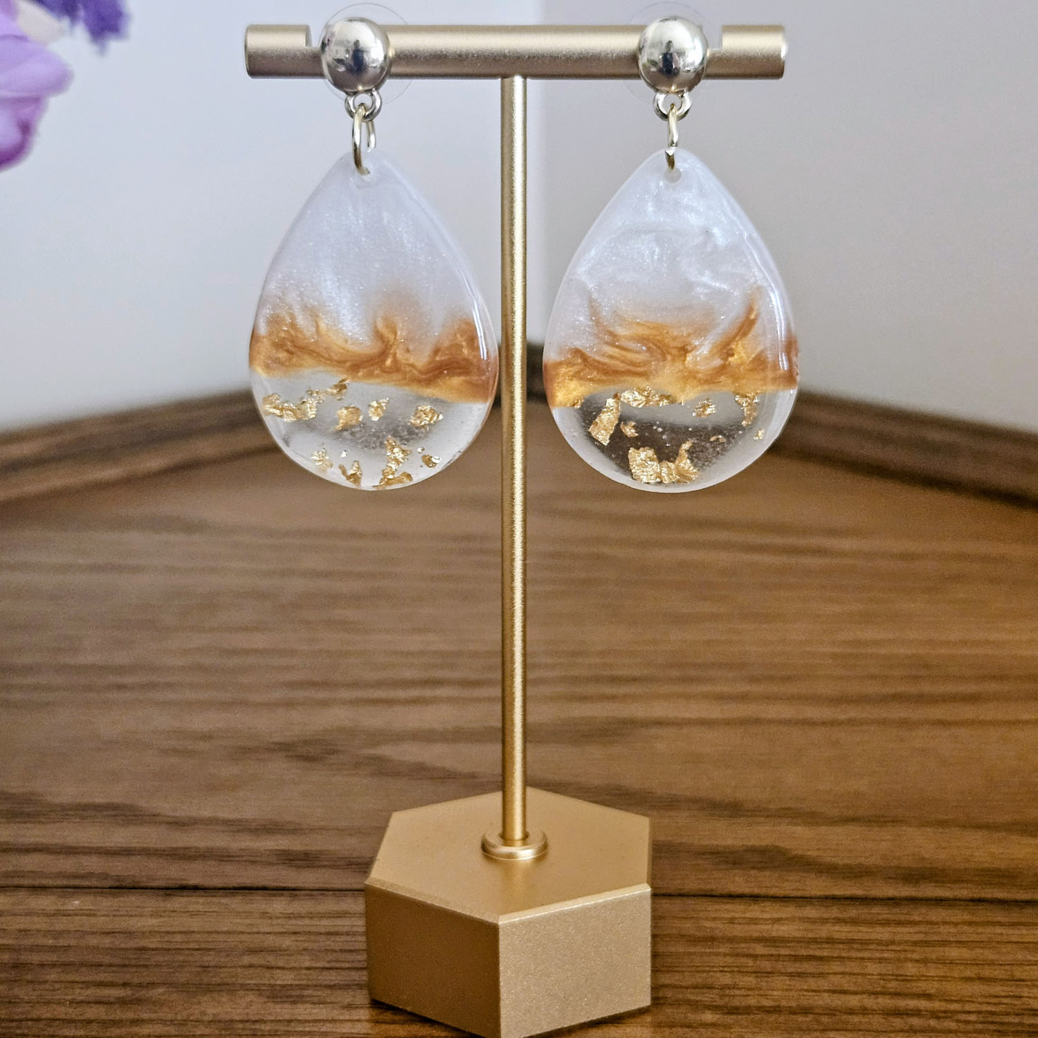Materials: UV resin, 18 carat gold plated jump ring, gold plated earring stud with stainless steel earring posts, white and gold pearlescent mica powder, gold foil.