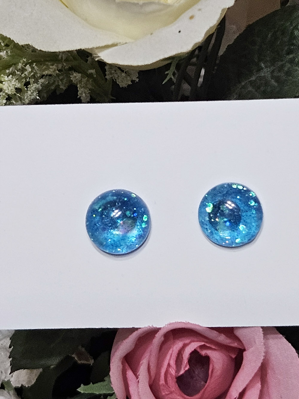 Materials: UV resin, stainless steel earring posts /hooks. ( 18 carat gold plated stainless steel earring post/hooks), pearlescent mica powder, glitter, iridescent flakes, —- foil.